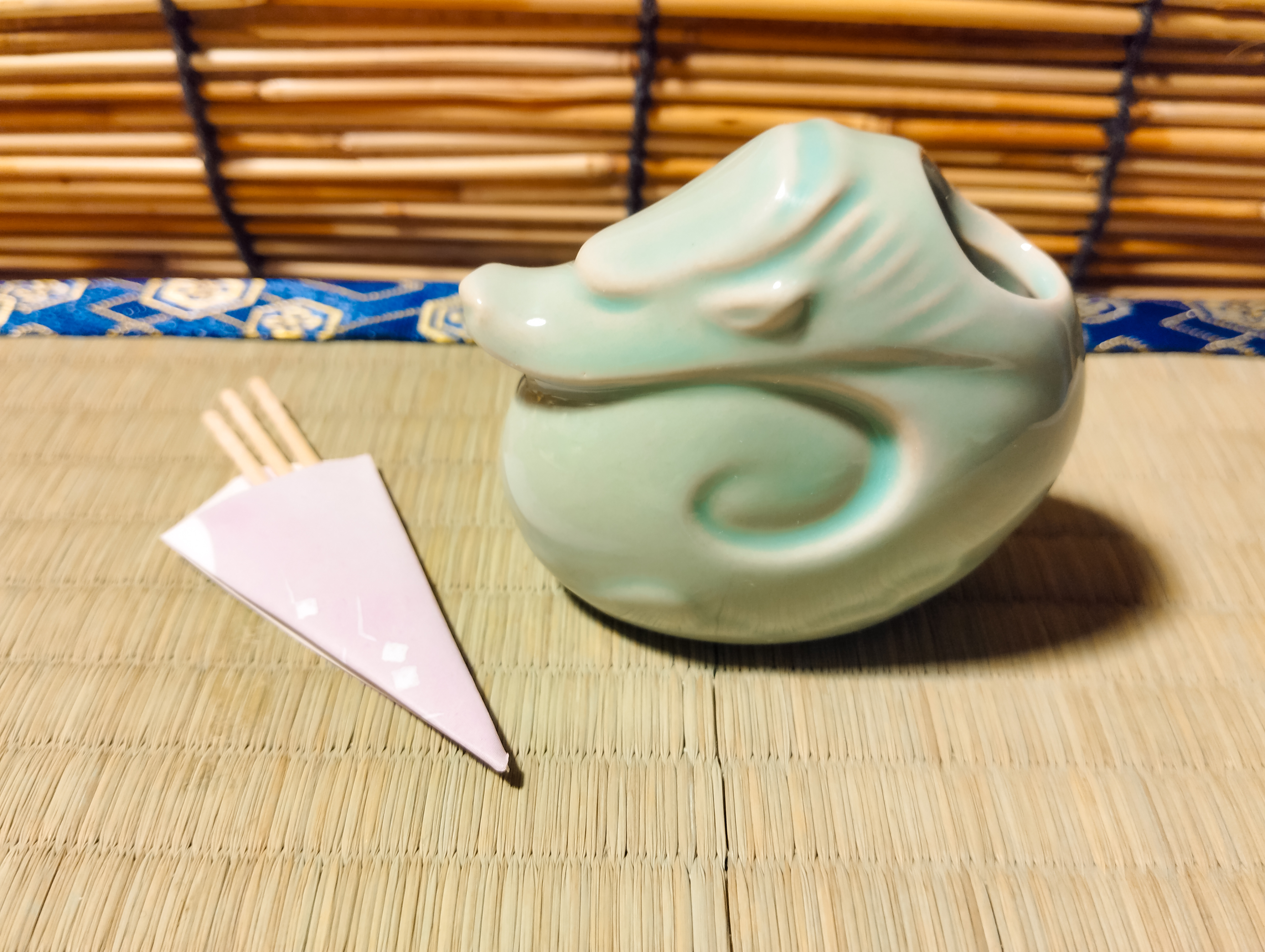 戴きものの楊枝入れ。来年の干支である辰年の置物にもなる、ちょっとふてくされた雰囲気がカワイイ一品。そういや楊枝って持ち手の凹凸が今度からなくなるそうですよ。しかしそもそも論としてこの部分って何のためって、ただの飾りらしいんですけどね(*´Д`)こけしに模したんだとか