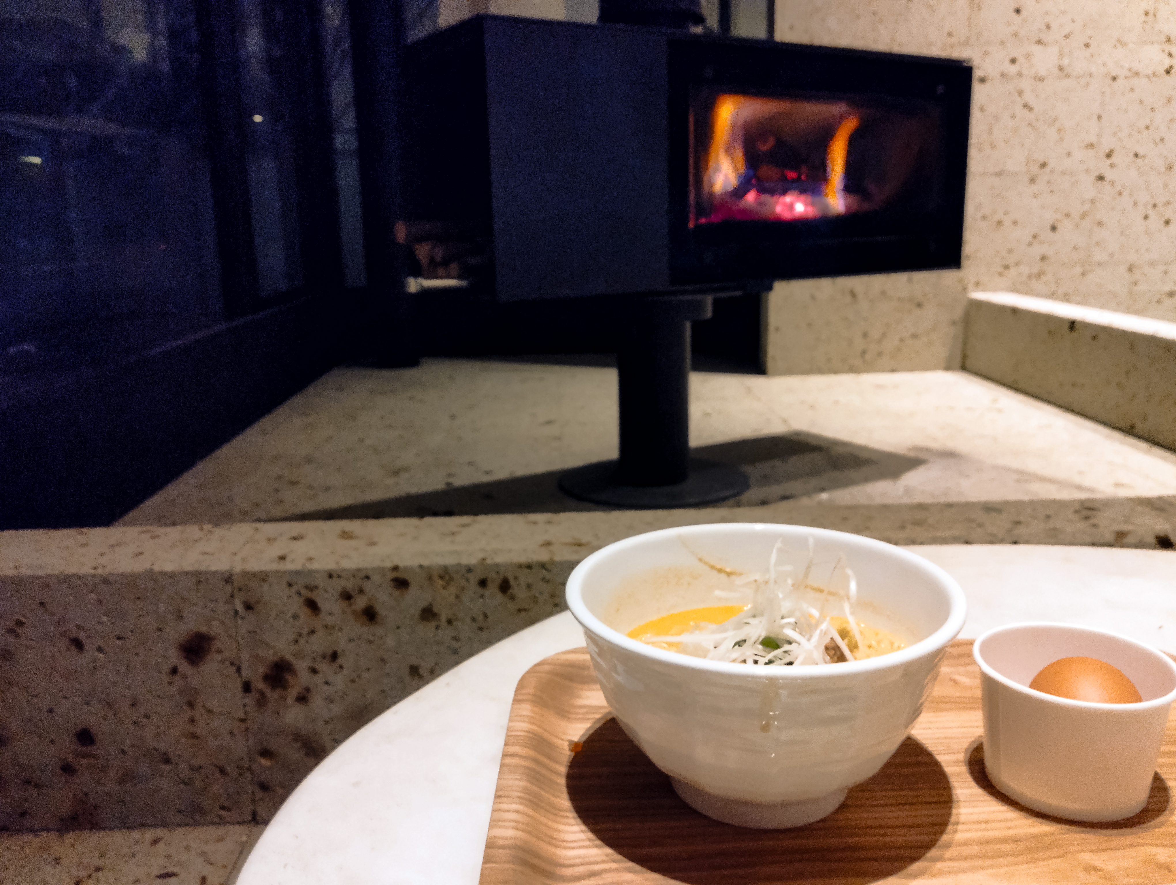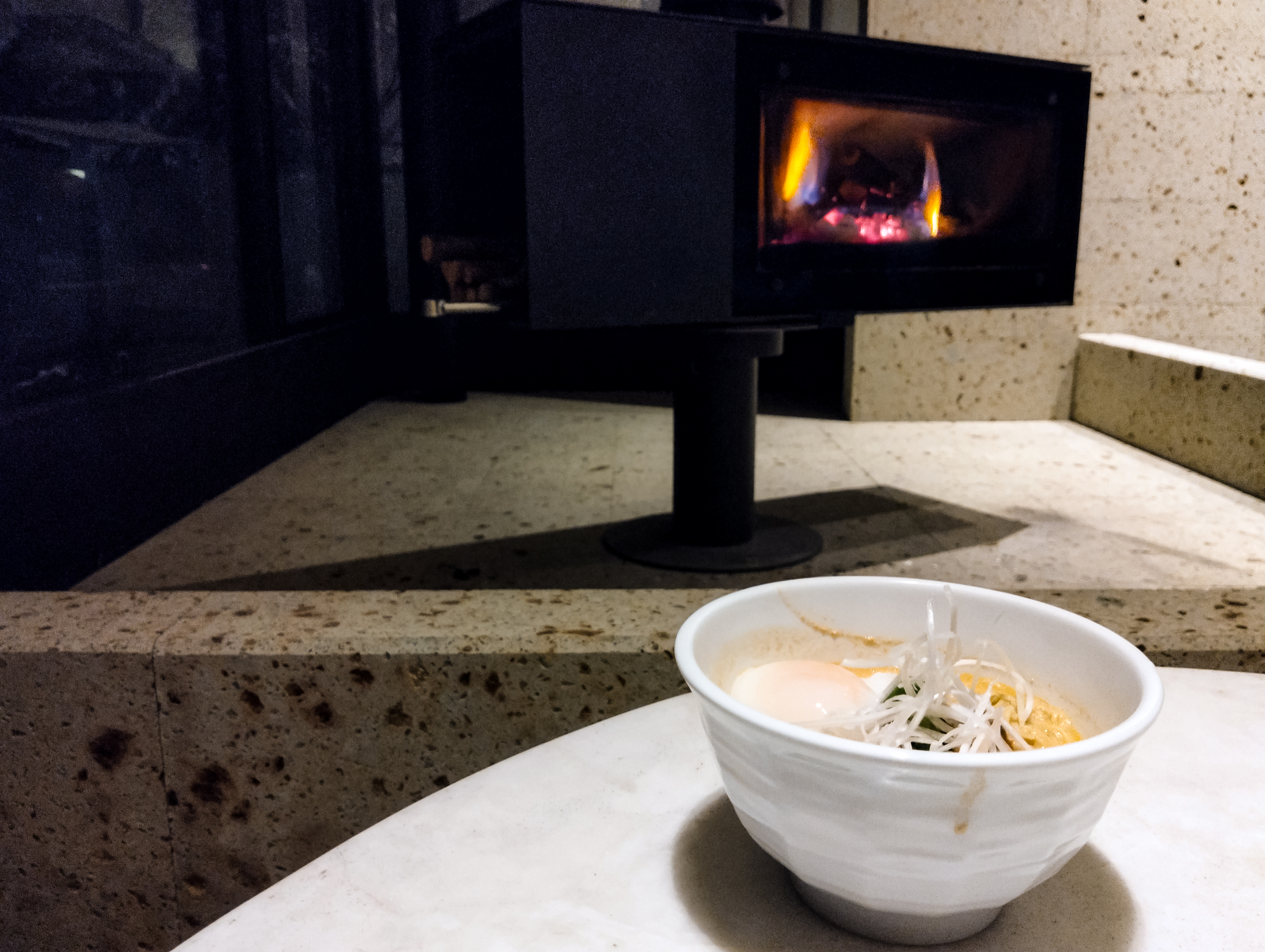 暖炉の前で担々麺いただきます - 湯西川温泉「亀の井ホテル 日光湯西川」(栃木県日光市湯西川1033)