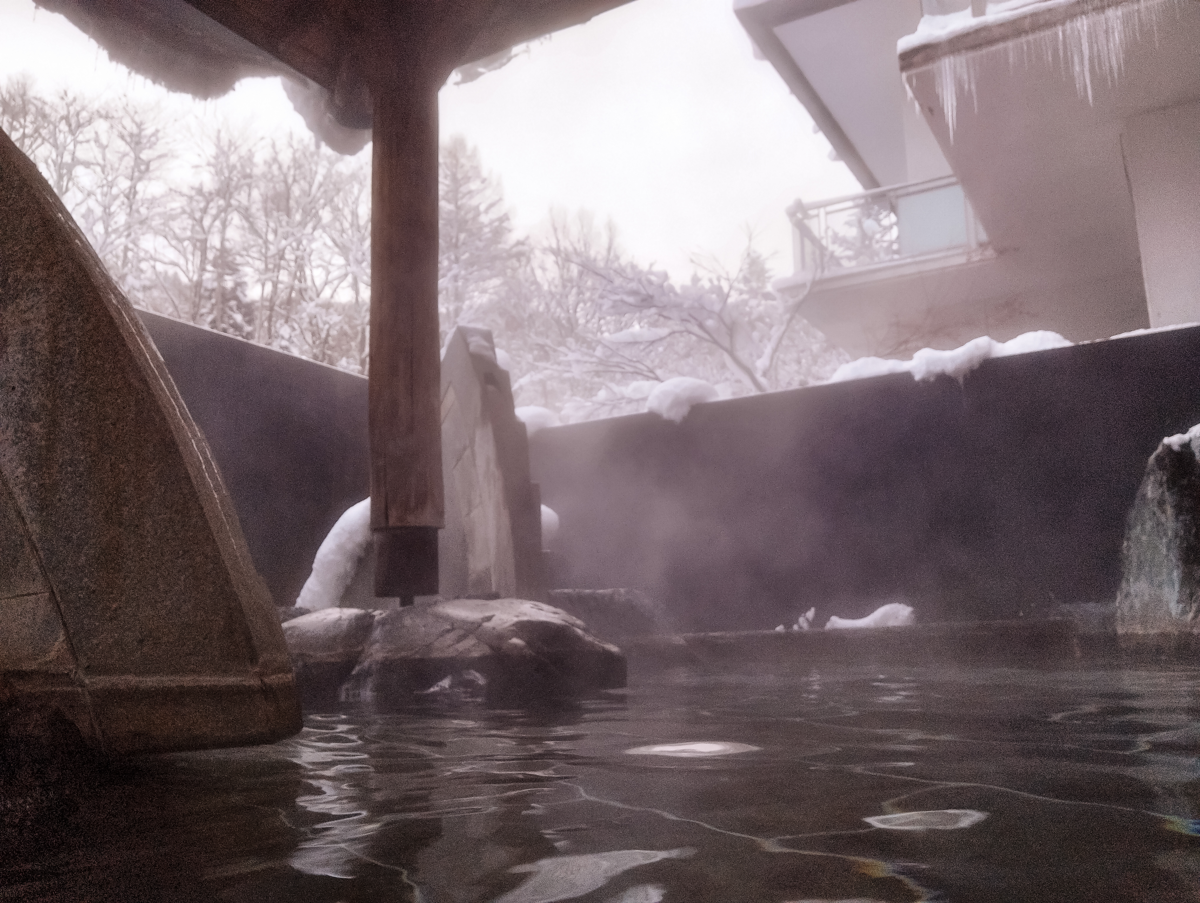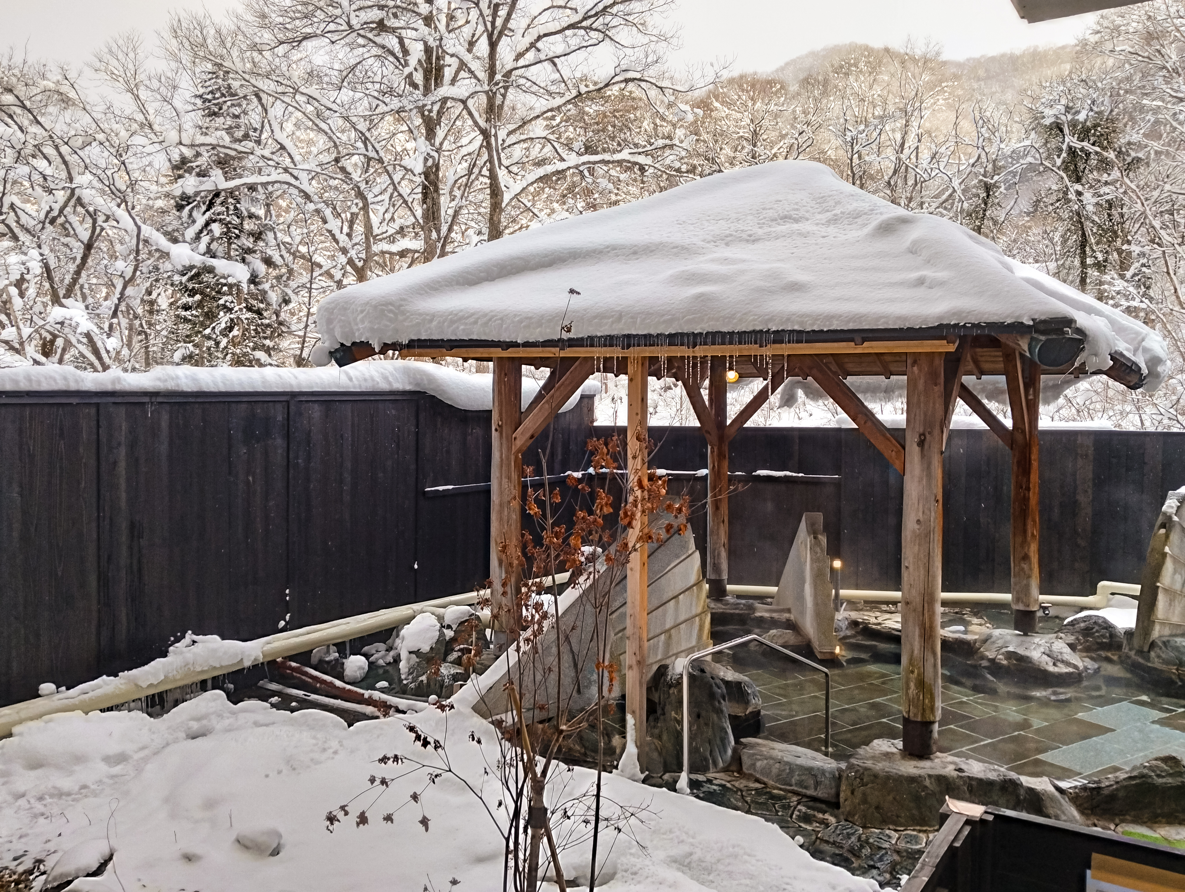 窓の外に見える露天風景。ふんわり雪乗っけた東屋からは氷柱も下がっててこの上なき良き湯けむり風情!ヾ(≧▽≦)ノこれを待ってた