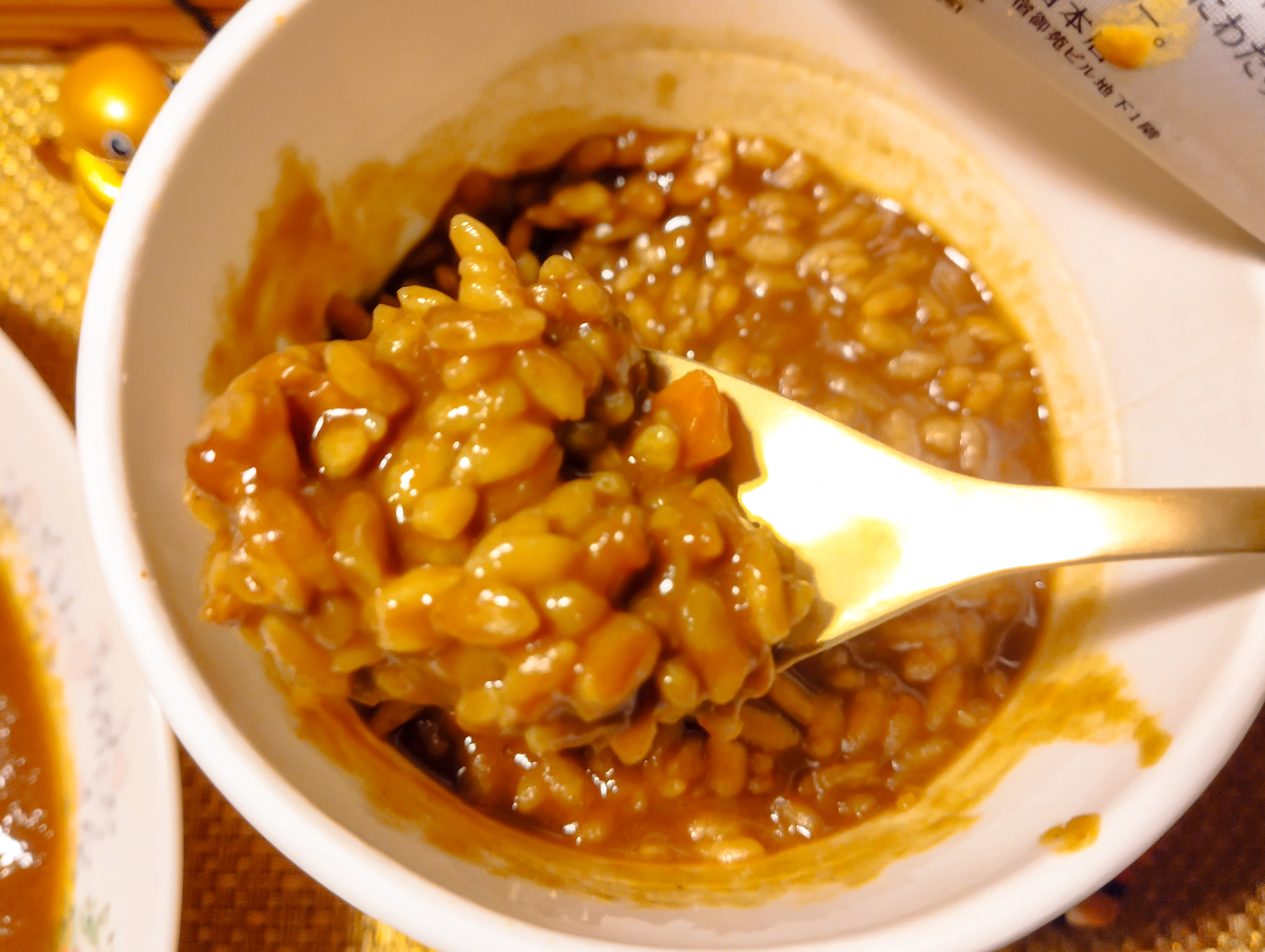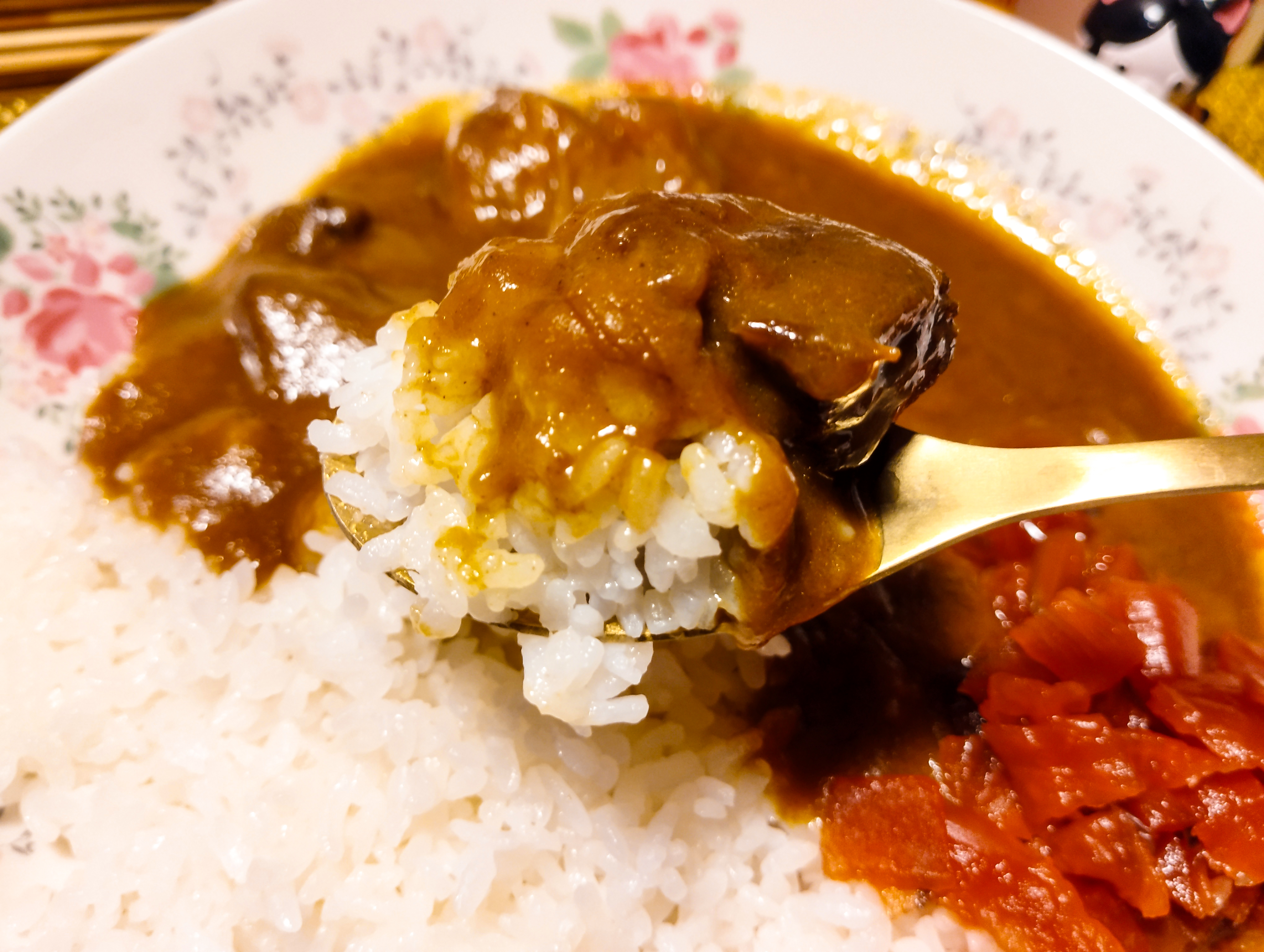 んでわまづもって動画でもご紹介されたレトルトの方から戴きす!!……うん、なんぢゃこりゃああー!あ、あ、ああ甘~い!!なんちゅー甘さぢゃこりゃ!!まさにサラスヴァティー姐様の金運MAXのごとき甘さ!こりゃフルーティーというか……いやもうフルーティーだべさなぁ~こりゃどう考えても!!ああああーこーれは高いやつ!間違いなく高いやつ(´;ω;`)バラモンが食べるやつだこれ