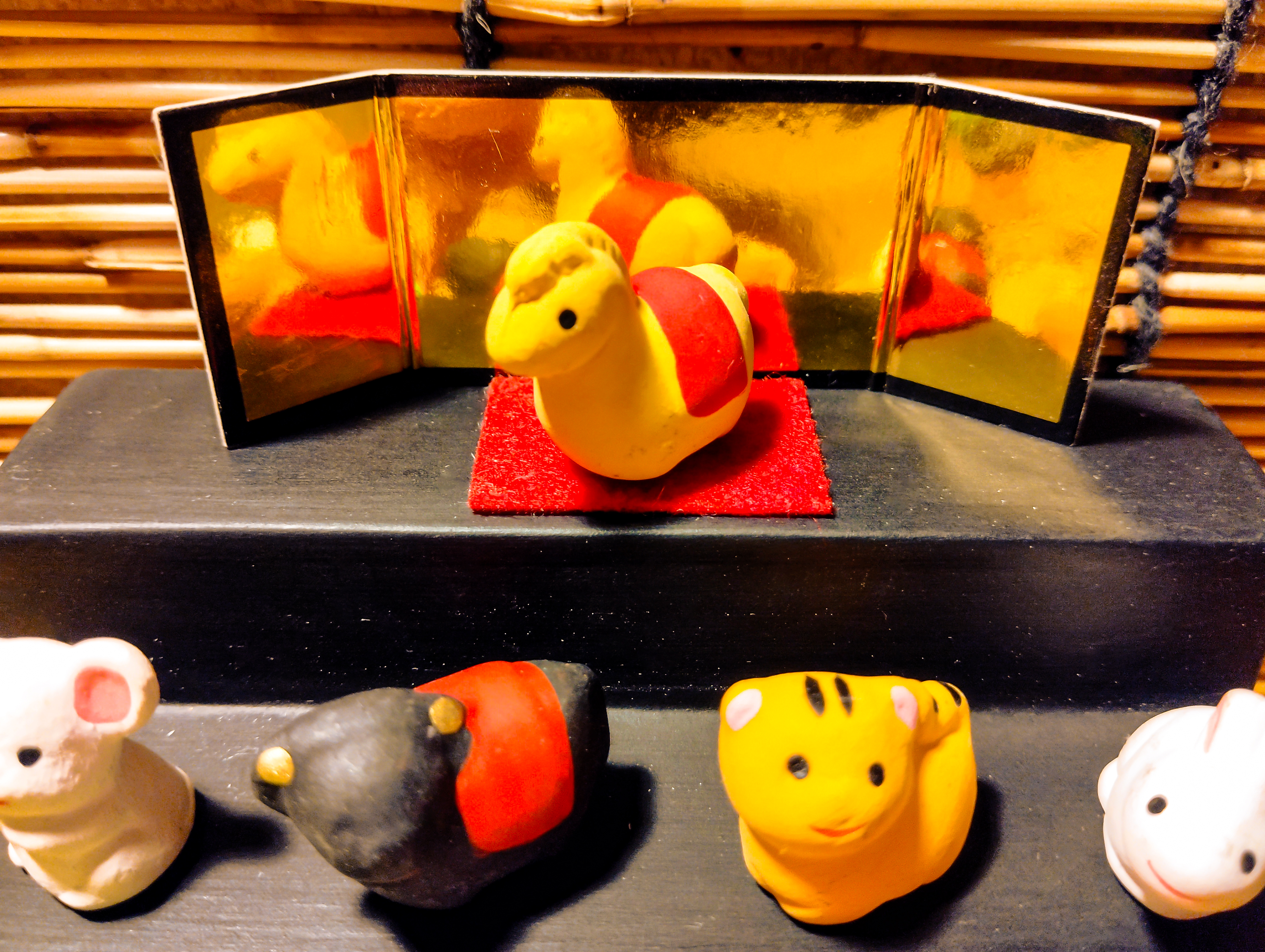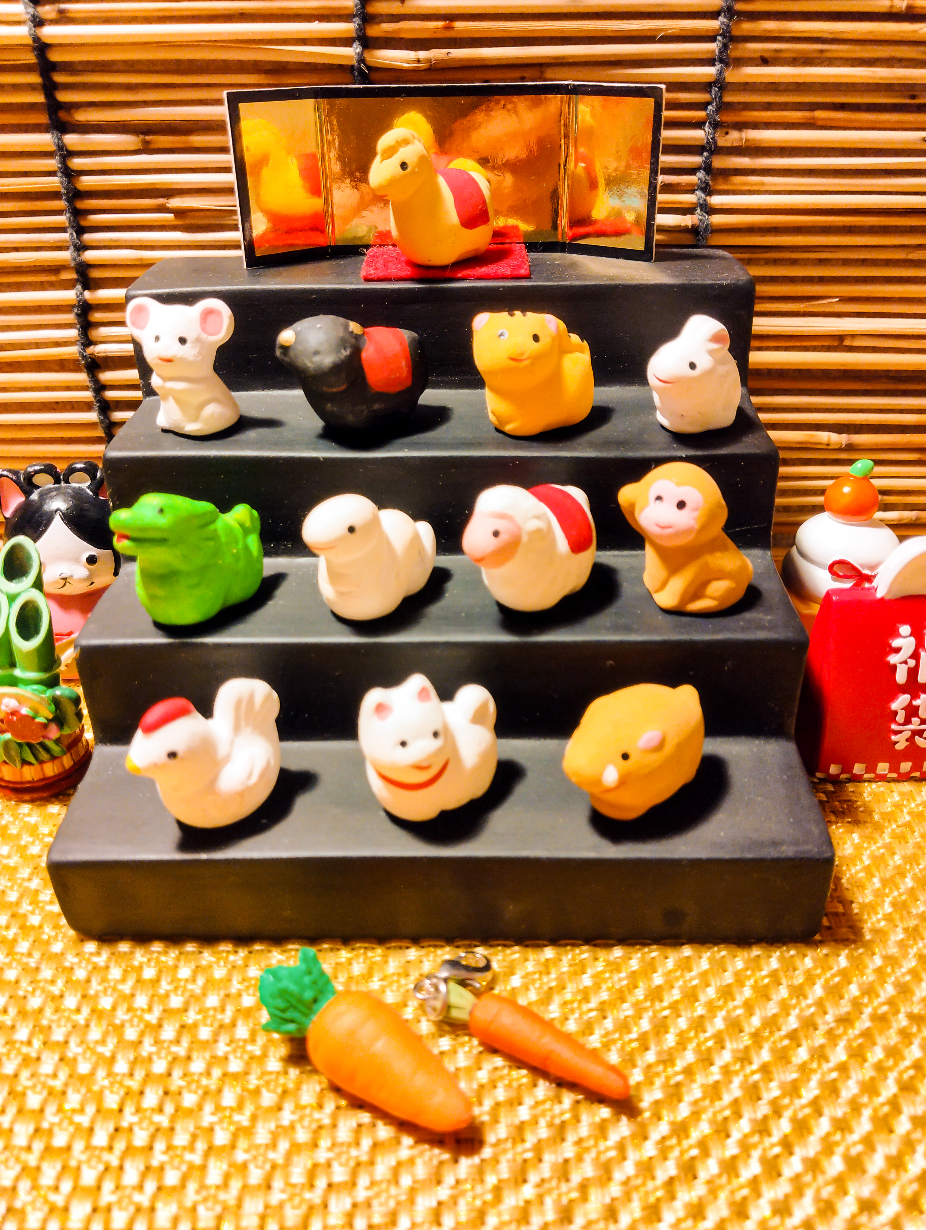 ほうしてさっそく毎年恒例の干支ひな壇の更新で!馬らしいグッズはわたい何一つ手元にありんせんでしたので、せめておもしろ消しゴムとフーズフードからニンジンさんをお供えいたしまし( ;∀;)