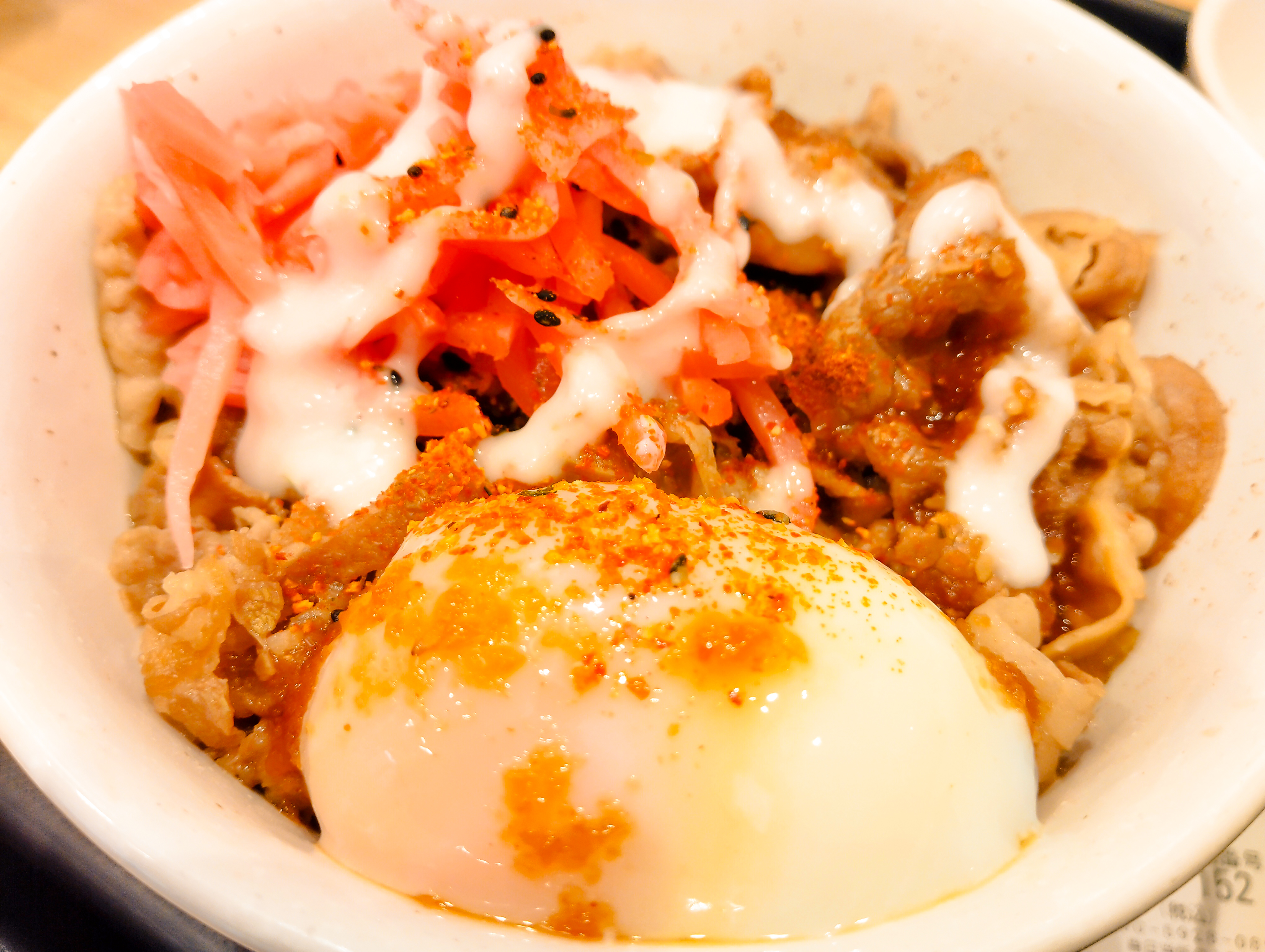 ほんなわけで温玉のっけのフレンチドレッシングに七味もわっさと振ってからの~戴きやーんし!おおーなるほどこの受け取り口にあった粉の正体が薄っすらわかりましたわい!これは激辛粉ですな!でも異国情緒ある系の風合いで牛丼が世界基準に感じられる良い粉です!これは振るべしですな(∩´∀`)∩うーまうまうま